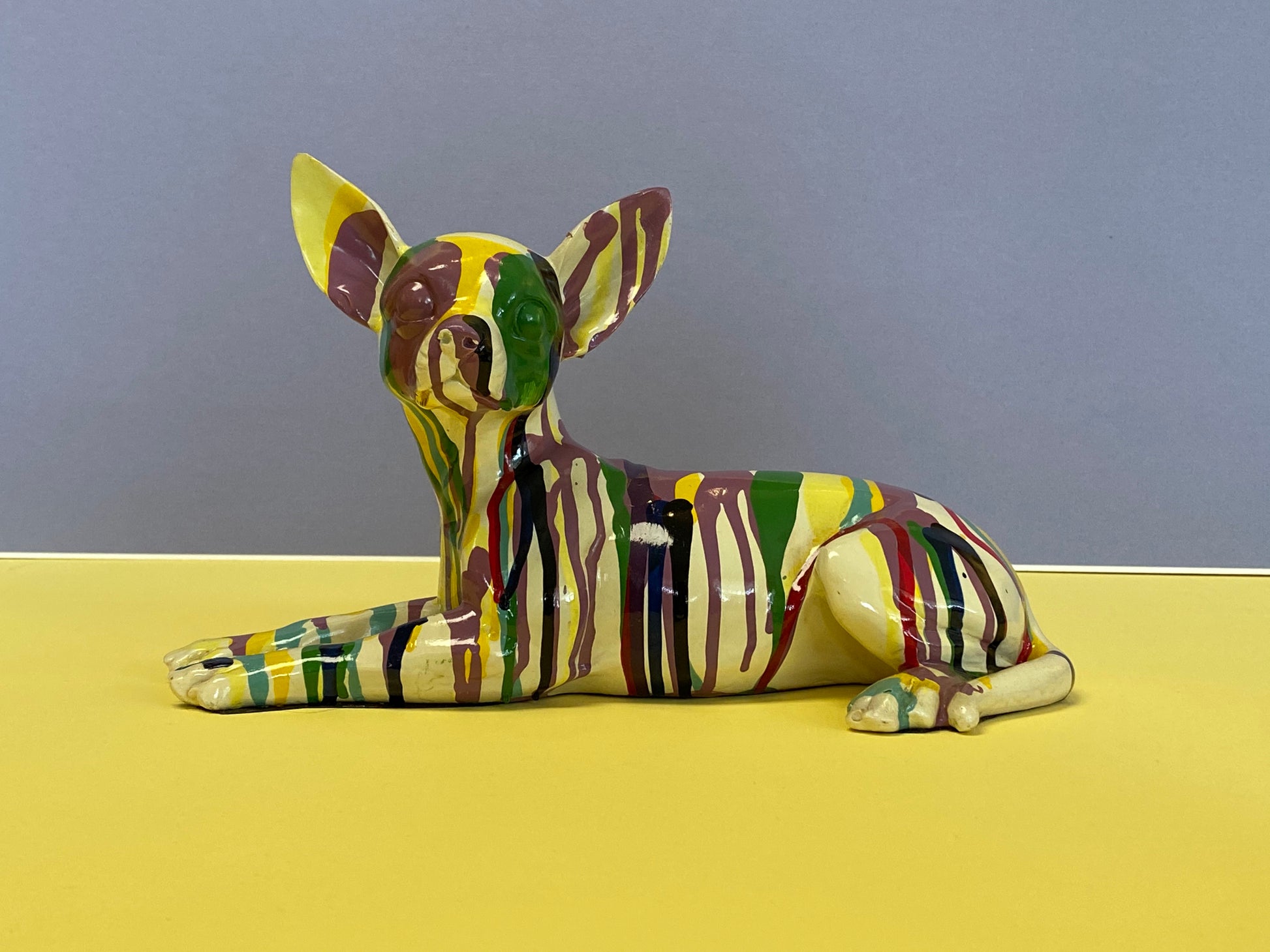 Waiting to greet you with unconditional love! This chihuahua will add color and design to any bookcase. Sits 11" long by 7" high, made from resin and hand painted.