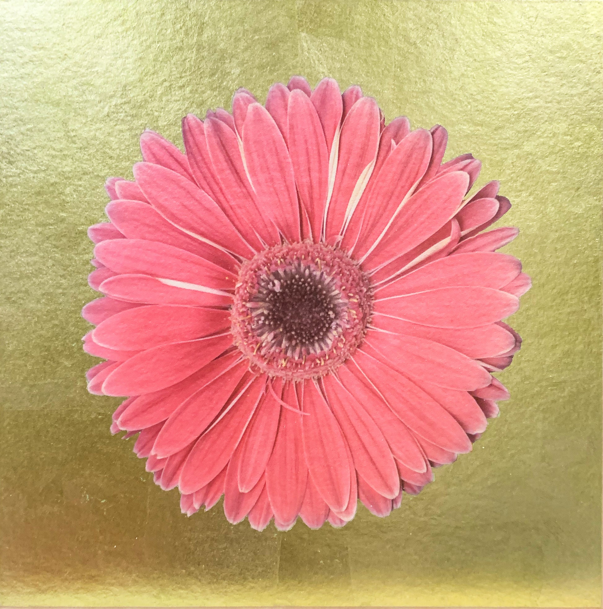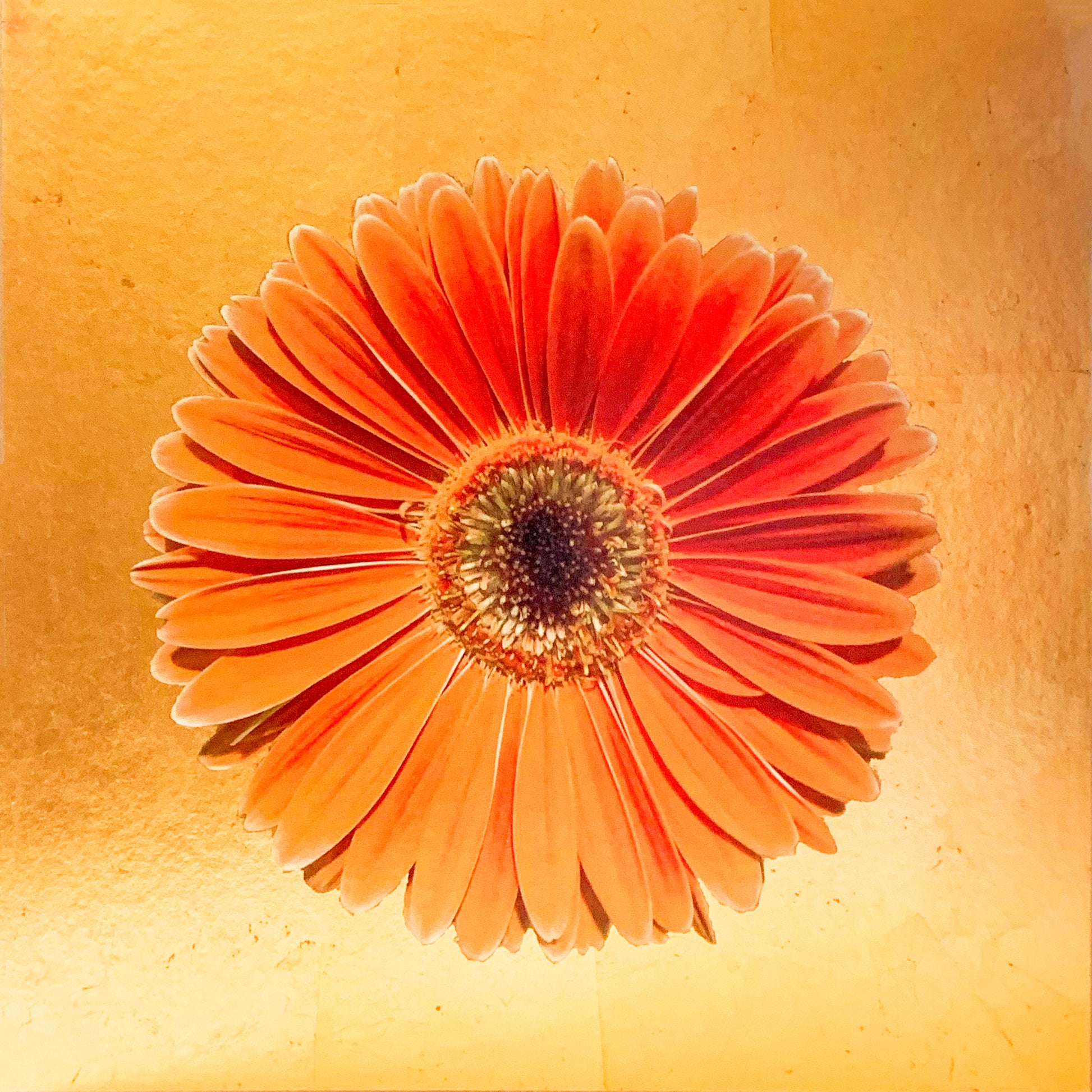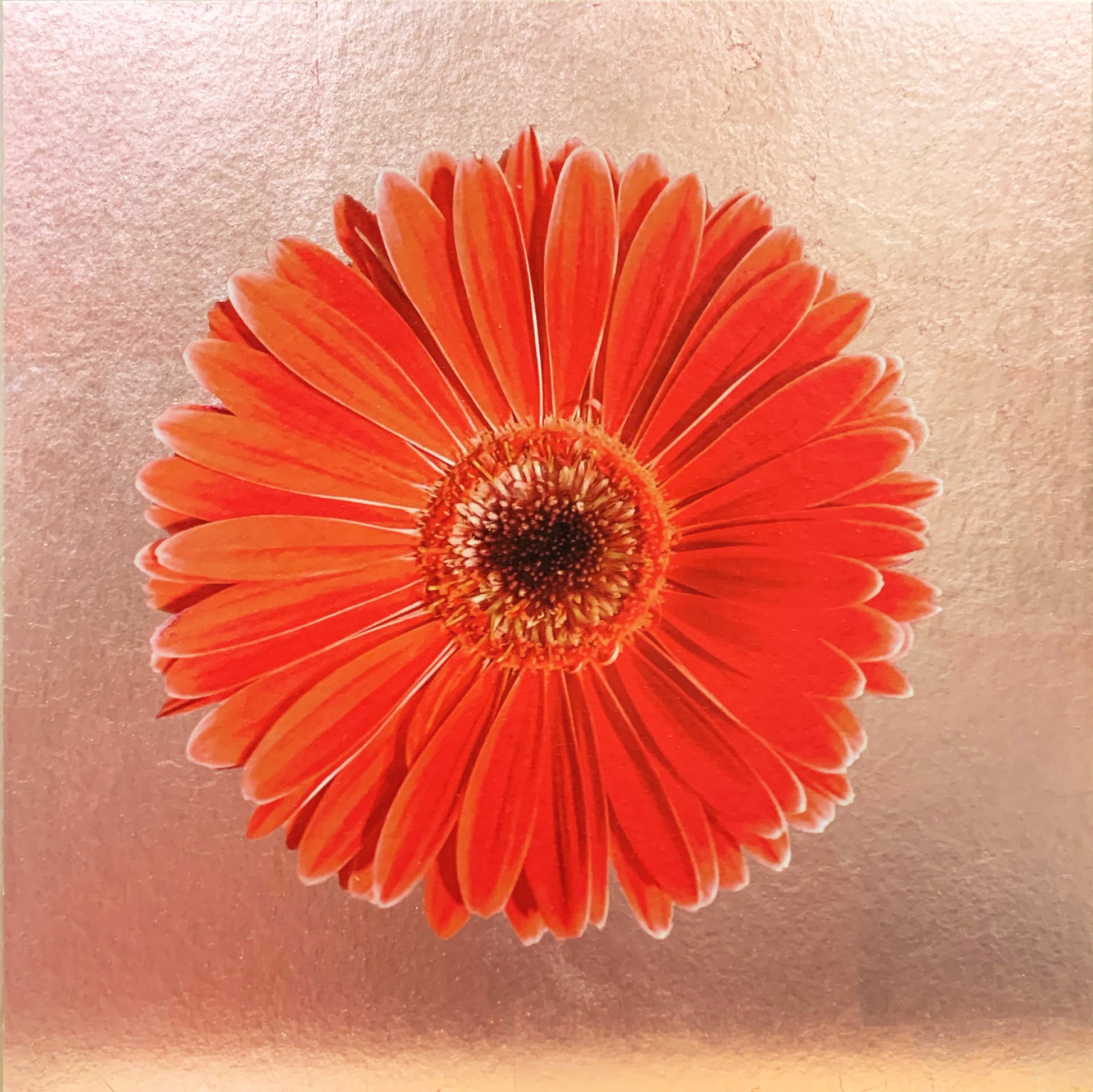 This mixed-media, 12"x12" piece consists of paint, ink and sterling silver, hand-dyed Japanese leaf. The Colorburst series was mounted onto cradle board.