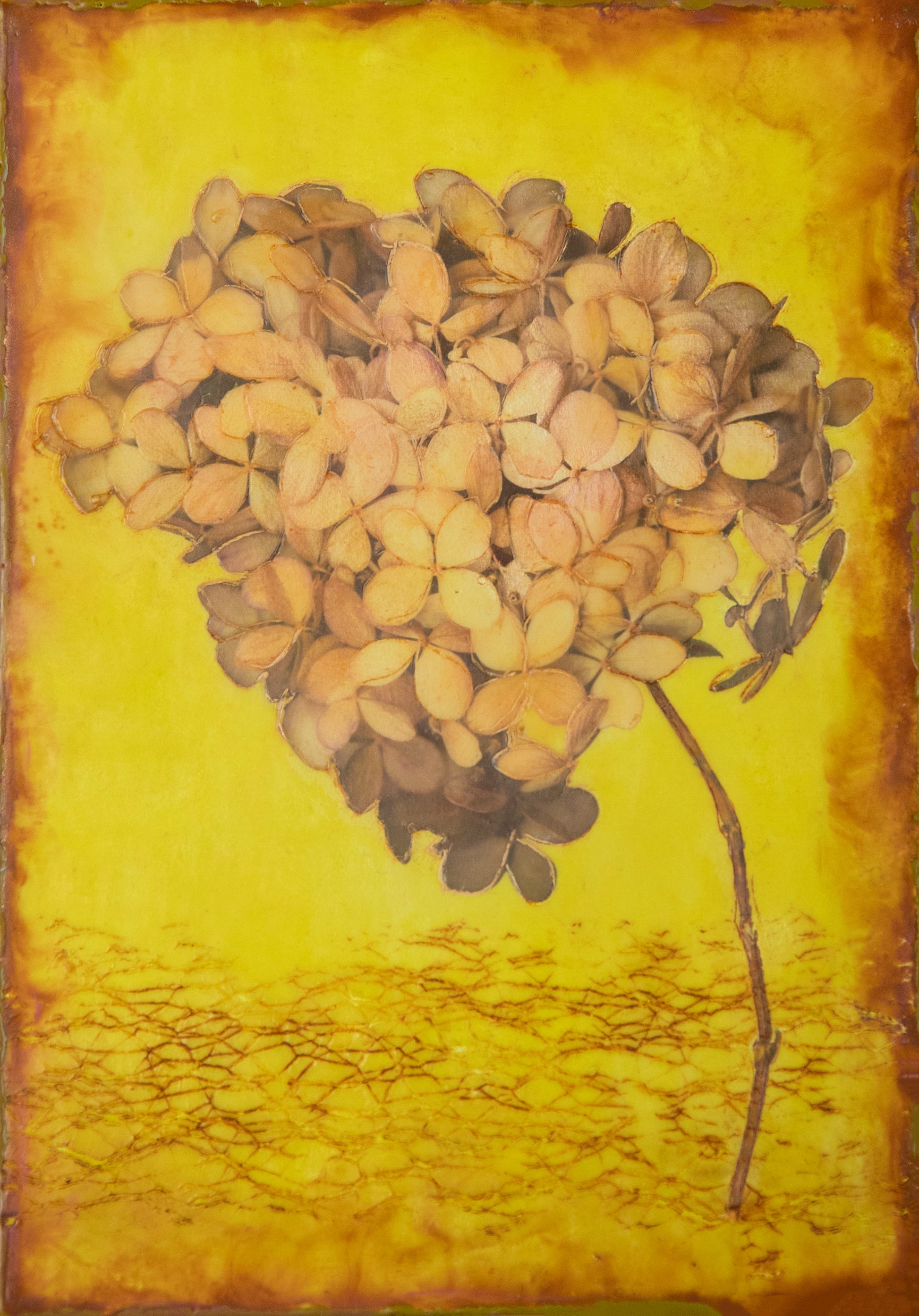 Ms. Jellenik starts her process by collecting images of flowers, shells, leaves, branches, and other natural elements. She then digitally edits them to achieve a more graphic appearance. When she’s happy with the composition, she prints them on hand-painted, leafed paper or plain paper. Then she adds other media, such as paint, print, metal, or wax, on top. This layering creates texture that highlights her subjects and celebrates the beauty of the natural world. “I am fascinated by how the process of combining materials with my photos adds depth, creates tension, and changes the feel of the work,” says Ms. Jellenik.