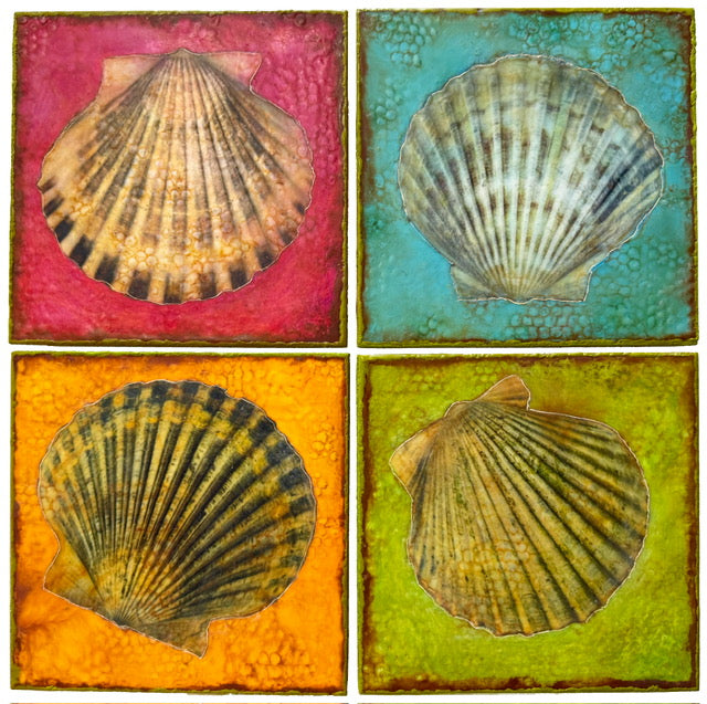 Ms. Jellenik starts her process by collecting images of flowers, shells, leaves, branches, and other natural elements. She then digitally edits them to achieve a more graphic appearance. When she’s happy with the composition, she prints them on hand-painted, leafed paper or plain paper. Then she adds other media, such as paint, print, metal, or wax, on top. This layering creates texture that highlights her subjects and celebrates the beauty of the natural world. “I am fascinated by how the process of combining materials with my photos adds depth, creates tension, and changes the feel of the work,” says Ms. Jellenik.