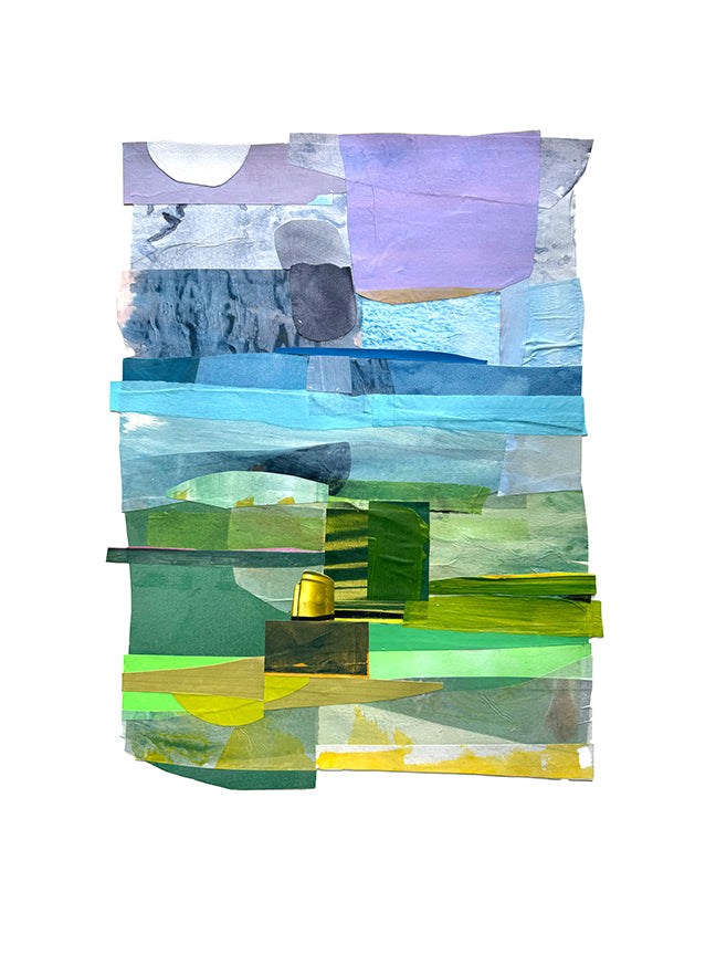 Ms. Sillen’s work features landscape-inspired torn paper arrangements. It explores themes of abstraction, space, light, color, texture, and improvisation. She gathers paper from discarded mail, books, and magazines. Her process begins with painting the papers and then exploring color through cutting and manipulation, evolving through intuition and experimentation. “I have always sought wonders in everyday life and nature; remaining open, accepting, and recognizing potential in objects (and people) that others might overlook,” says Ms. Sillen.