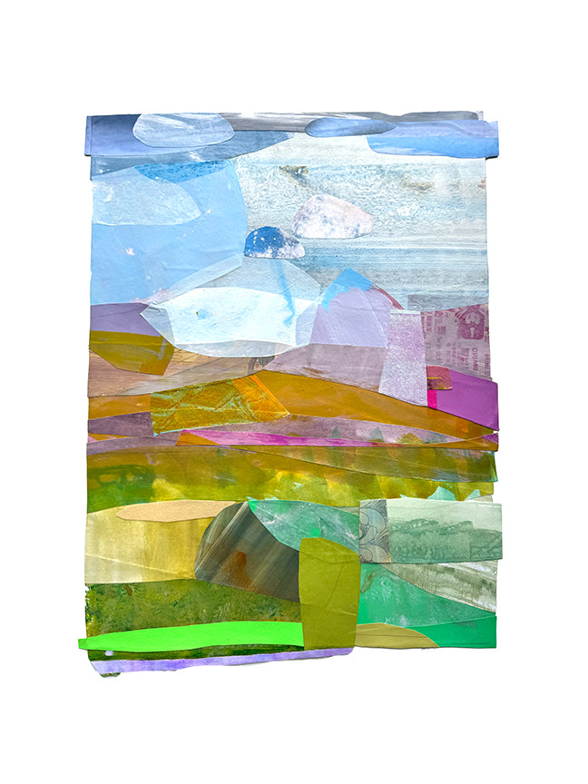 Ms. Sillen’s work features landscape-inspired torn paper arrangements. It explores themes of abstraction, space, light, color, texture, and improvisation. She gathers paper from discarded mail, books, and magazines. Her process begins with painting the papers and then exploring color through cutting and manipulation, evolving through intuition and experimentation. “I have always sought wonders in everyday life and nature; remaining open, accepting, and recognizing potential in objects (and people) that others might overlook,” says Ms. Sillen.